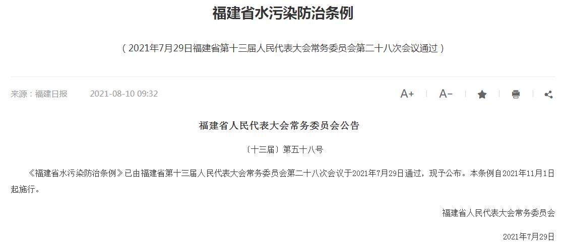第七十條 本條例自2021年11月1日起施行。2011年12月2日福建省第十一屆人民代表大會常務(wù)委員會第二十七次會議通過的《福建省流域水環(huán)境保護條例》同時廢止。
