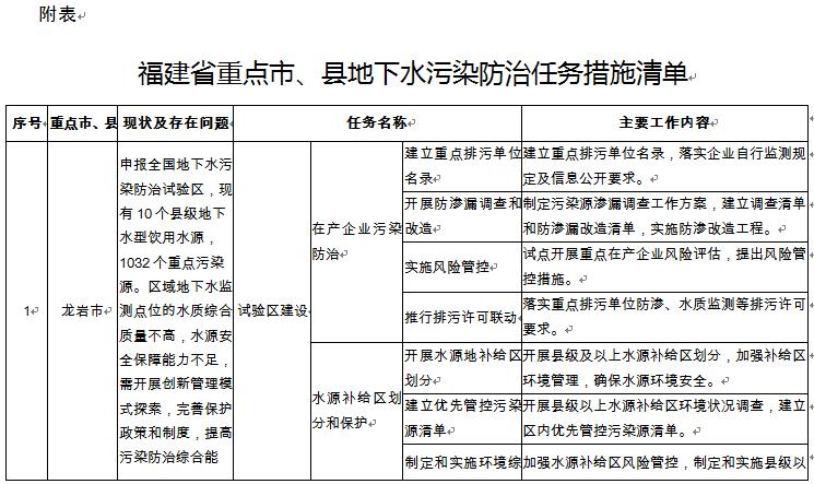 地下水污染防治先行先試。立足省情,選擇典型區(qū)域開展地下水污染防治先行先試,探索治理模式與工作經驗。在龍巖、三明等具有典型城鎮(zhèn)地下水型飲用水水源地的地區(qū),啟動地下水環(huán)境狀況調查評估工作,在漳州、泉州等地下水污染防控重點區(qū)域,開展典型污染源地下水環(huán)境狀況調查或防滲改造項目。同時,加快地下水環(huán)境監(jiān)管基礎能力建設試點,啟動龍巖市地下水環(huán)境監(jiān)管能力平臺建設。