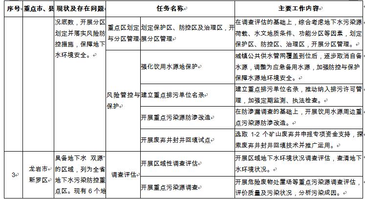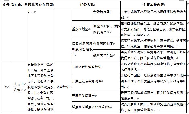 1.區(qū)域地下水環(huán)境狀況調查評估。在九市一區(qū)開展市級的地下水環(huán)境狀況調查評估,摸清區(qū)域地下水環(huán)境質量狀況。 2.化工園區(qū)地下水環(huán)境狀況調查評估。以省級以上化工園區(qū)為重點,開展全省化工園區(qū)地下水環(huán)境狀況調查評估。 3.非化工類重點排污單位地下水環(huán)境狀況調查及監(jiān)測。開展危險廢物處置場、垃圾填埋場地下水環(huán)境狀況調查評估;開展上杭紫金山金銅礦等礦山開采區(qū)地下水環(huán)境狀況調查評估;地下水重點排污單位開展地下水環(huán)境狀況調查監(jiān)測。 |