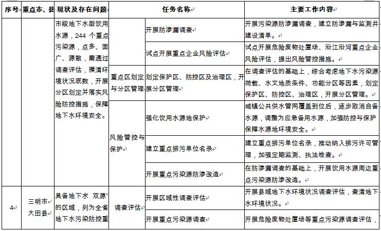 1.污染防治重點區(qū)劃定及分區(qū)管理試點。開展九市一區(qū)地下水污染防治重點區(qū)劃定工作。在龍巖新羅和連城、三明大田開展地下水環(huán)境分區(qū)管理試點。 2.重點污染源地下水污染風險管控與修復。實施重點污染源(化工園區(qū)、危險廢物處置場和生活垃圾填埋場等)地下水污染風險管控,以省級以上化工園區(qū)為重點開展地下水污染風險管控。開展漳州古雷港開發(fā)區(qū)重點企業(yè)地下水污染風險管控與修復試點。 3.礦山廢棄井封井回填。探索廢棄井封井回填技術,在三明市尤溪縣等礦山開采集中的區(qū)域開展廢棄井回填試點。 |