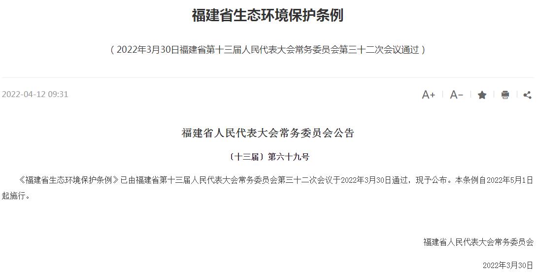 第七十四條 本條例自2022年5月1日起施行。1995年7月5日福建省第八屆人民代表大會常務(wù)委員會第十八次會議通過,2002年1月20日福建省第九屆人民代表大會常務(wù)委員會第三十次會議修訂,根據(jù)2012年3月29日福建省第十一屆人民代表大會常務(wù)委員會第二十九次會議通過的《福建省人民代表大會常務(wù)委員會關(guān)于修改部分地方性法規(guī)的決定》修正的《福建省環(huán)境保護(hù)條例》同時廢止。