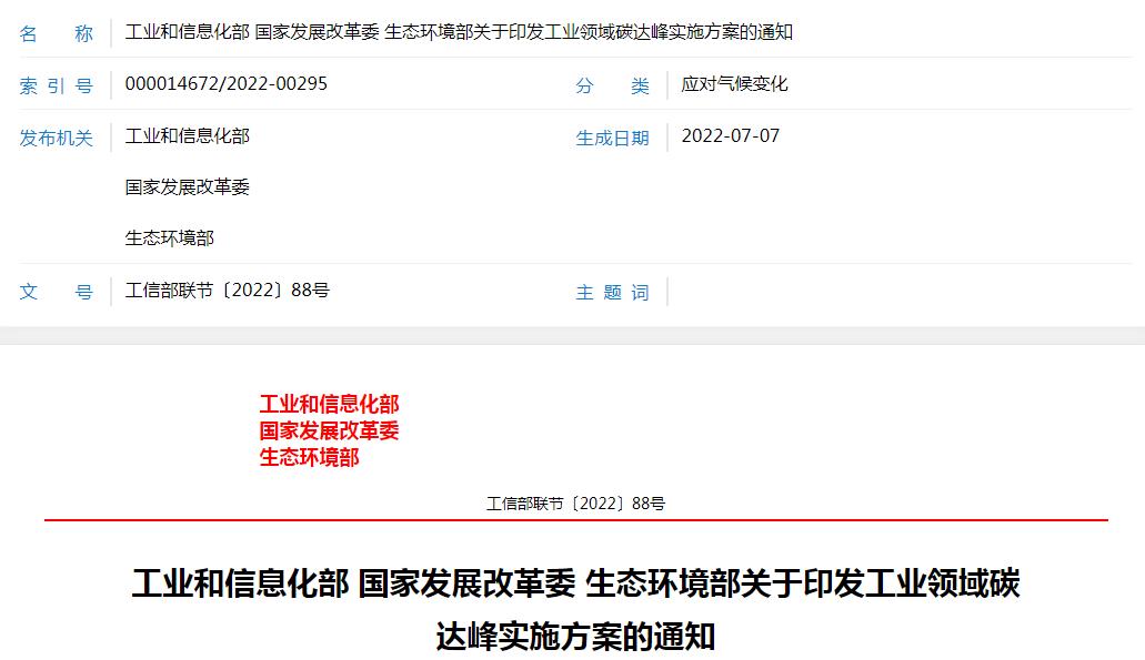 《工業(yè)領(lǐng)域碳達峰實施方案》已經(jīng)碳達峰碳中和工作領(lǐng)導(dǎo)小組審議通過,現(xiàn)印發(fā)給你們,請認真貫徹落實。