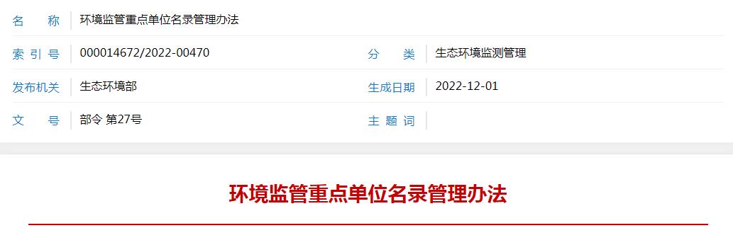 《環(huán)境監(jiān)管重點單位名錄管理辦法》已于2022年8月15日由生態(tài)環(huán)境部2022年第四次部務會議審議通過,現(xiàn)予公布,自2023年1月1日起施行。